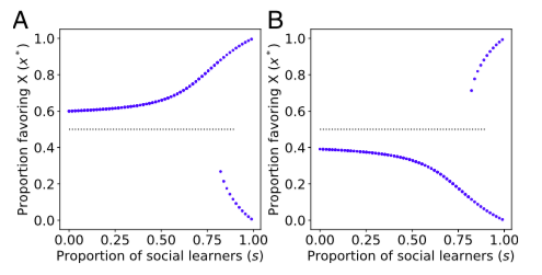 假设两种选项的收益相等,当社会学习者的比例超过临界值时,模型指出,在演化的终点,选择两种选项的人的比例不会如之前是稳定的。随着社会学习者的比例提升到70%以上,最终达成的稳定态中,社会中选择两种原本等价选项的比例会变得越来越悬殊(图2A)。