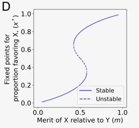 图4:不同选项的相对价值带来的影响会使得选择对应选项的比例存在一个不稳定态。
