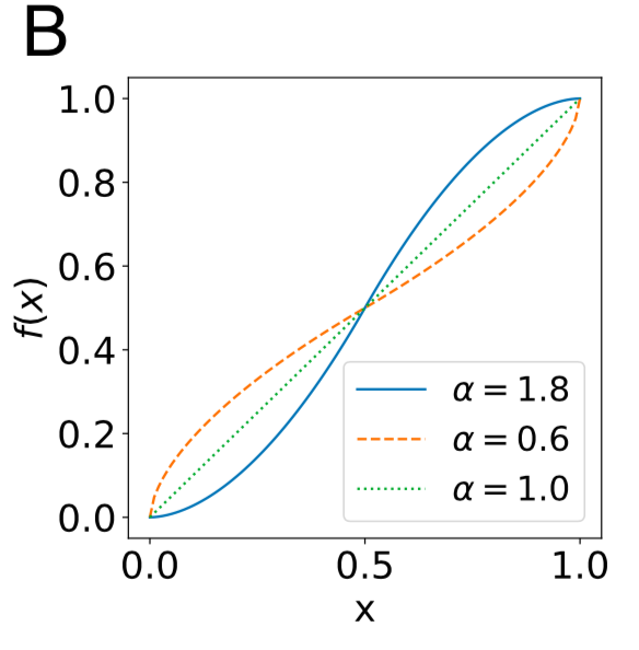 图1:社会学习者的三种学习函数(conformity function)。横轴表示,面临两个选项X和Y,某个社会学习者随机看到的人群中,有多少比例选择了 X,纵轴表示他们有多大的概率改弦更张,从选项Y转变为X。