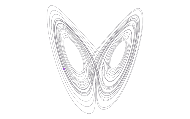 但对于洛伦兹方程这样的混沌非线性系统来说,它对于初始条件的误差要远比子弹这样的线性系统来说敏感得多。因为子弹的误差是随子弹飞行时间线性放大的;而洛伦兹天气系统的误差放大是指数级别的。这就意味着,开始的时候,你预测的天气系统仅仅有万分之一的误差,但经过两天以后,你的模型就和真实天气系统产生了天壤之别,简直就毫无关系了。所以才说,亚马逊雨林的蝴蝶,小小地扇动了一下翅膀,有可能造成遥远地方的一场巨大的暴风雨。这种对初始误差的敏感性就被后来的人们称之为蝴蝶效应了。
