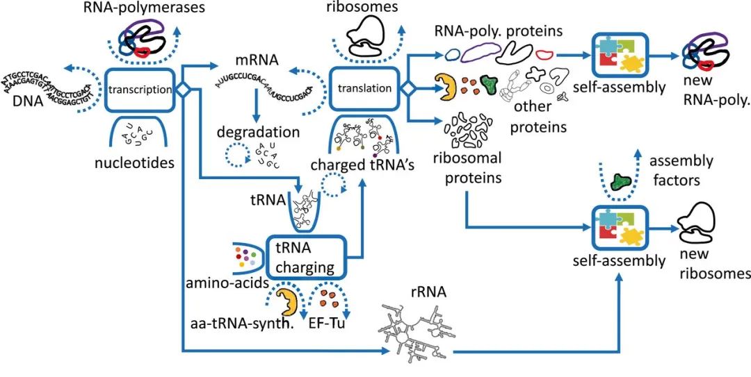要成为一个“通用构造机”,转录-翻译机器必须能够自我复制。转录-翻译机器的自复制是个复杂、但所有单细胞生物均俱备的过程。该自复制过程由两个重要的自催化循环所构成:RNA聚合酶自催化循环以及核糖体自催化循环。如果RNA聚合酶没有转录出核糖体RNA(rRNA),细胞就不能从头合成新的核糖体;同理,如果没有核糖体翻译出RNA聚合酶蛋白亚基对应的mRNA,RNA聚合酶的从头合成也就不能实现。因此,两个循环是耦合的,且都包括自组装的步骤。