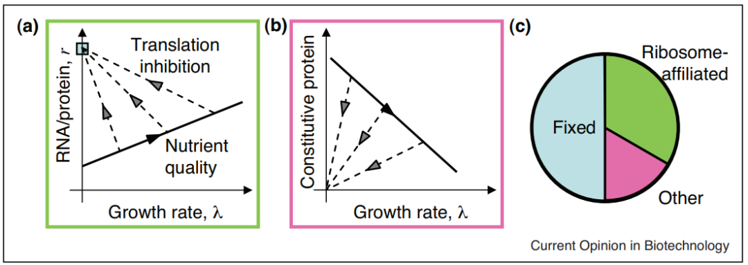 细菌生长规律(growth law)旨在研究在忽略细胞内因相互干扰的情况下,细菌生长所表现出的整体特征与某一组分之间简单的数学关系。例如:图1a表示了一组细菌生长速率λ与核糖体质量分数(纵轴,由于核糖体RNA占RNA约为85%,因此RNA/总蛋白比率与核糖体质量分数线性相关)之间的关系:当翻译工作正常时,生长速率与核糖体质量分数呈线性正相关(用实线表示);当翻译受到抑制时,生长速率与核糖体的关系呈负相关(用虚线表示);当完全抑制时,质量分数收敛于交点处,该点表示了翻译完全受限的情况下核糖体工作的分配情况。与图1a相似,图1b表示了不同情况下生长速率与非核糖体蛋白数量(图1c中粉色的部分)的线性关系。