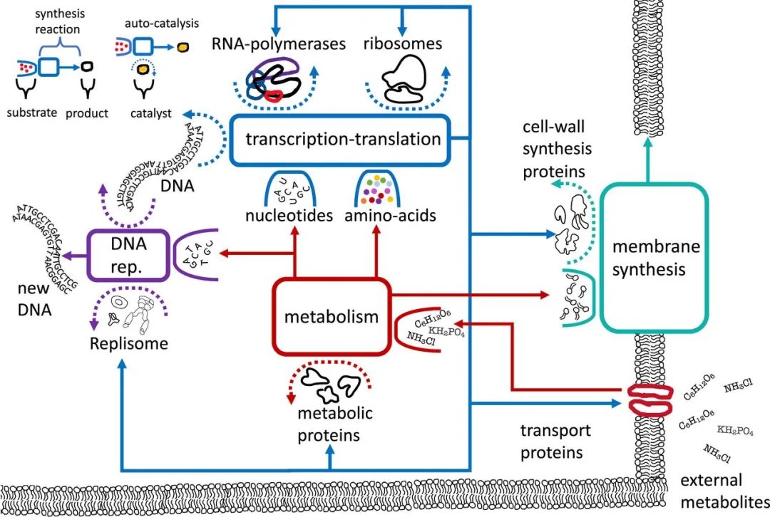 转录-翻译循环:消耗原材料和能量,产出包括自身的所有蛋白质及副本,提供大部分循环的催化剂 -