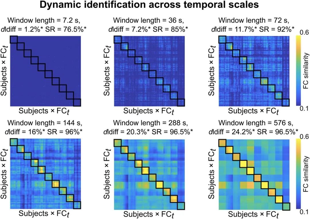 研究人员在人类连接组计划(Human Connectome Project,HCP)数据集的 100 个不相关主题上探索了不同时间尺度(窗口长度)上人类指纹的这些时间性方面。他们首先选择了六个不同的窗口长度(7.2、36、72、144、288 和 576 秒,固定滑动窗口步长为 7.2 秒),并探索了不同时间的动态差分可识别性(dynamic differential identifiabilit,dIdiff)和成功率 (success rates,SR)尺度上的表现。简而言之,dIdiff 是差异可识别性分数的扩展,最初评估每个受试者的 FC 自相似性与其他受试者的 FC 之间的差异。