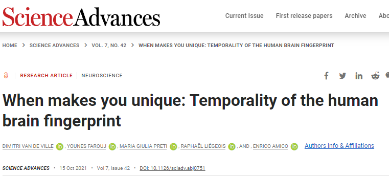 从人脑连接数据中提取“指纹”已成为神经科学的新前沿。然而,人类大脑可识别性的时间尺度在很大程度上仍未得到探索。在 17 世纪,医生 Marcello Malpighi 观察到指尖上存在独特的脊凸起和汗腺图案,这一关键观察导致了对基于指纹唯一识别个人的方法的长期持续探索,这种技术直到今天才被广泛使用。在现代,指纹识别的概念已扩展到其他生物识别数据,例如录音和视网膜扫描等。只是在过去几年中,技术和方法才实现了对个人大脑的高质量测量,以至于现在可以表征个性特征和行为。最有洞察力的相关性来自于结构和功能连接(functional connectivity,FC)的研究,可以使用网络科学进行建模和分析,该研究领域通常被称为大脑连接组学。对于结构连接组,成对的大脑区域之间的白质通路使用扩散加权成像进行量化,并称为结构连接(structural connectivity,SC)。对于功能连接组,这些区域的活动时间过程之间的时间统计依赖性来自功能磁共振成像 (fMRI) 以定义功能连接。