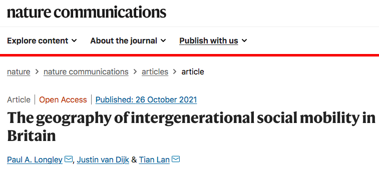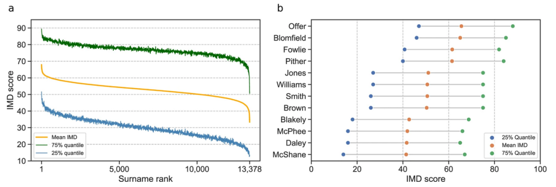 10月26日发表于Nature Communications 的文章结合多重匮乏指数(Index of Multiple Deprivation,IMD)及家庭姓氏的地理起源分布,对英国长期定居人口的家庭群体进行跨代分析,扩展以往经验性的社会流动性分析。其中,多重匮乏指数提供了对全英各个居民区相对困难程度的综合度量,包括收入、就业、健康、教育、犯罪等因素,概括了比个人或家庭收入及职业特征更长久的物质和社会条件。研究中采用姓氏作为共同地理及家族起源的方法,这是基于之前的一项研究结果,即未过度使用的姓氏可提供统一的地理及家族起源标记。