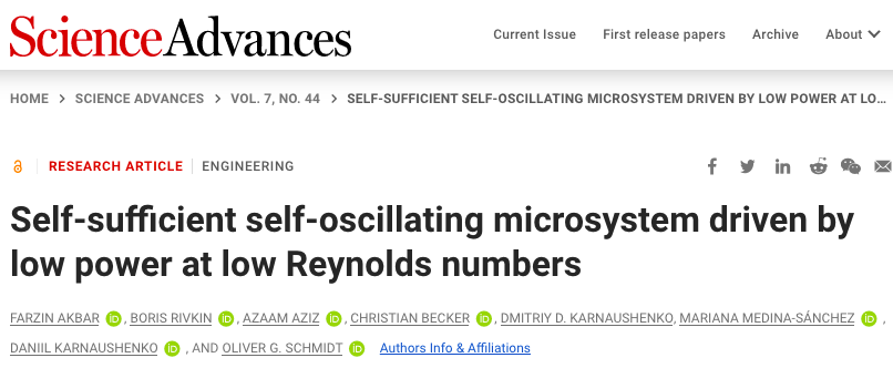 仿生、自供能及形状可变的自治振荡系统可应用于植入式医疗设备,其产生的振荡信号可作用于微执行器,进而模仿各种生物实体,如自然鞭毛的运动。但传统电路的功率要求与生物系统不兼容,因为高电压与高电流会引起水分解或不必要的氧化还原反应,其它微机电系统(MEMS)则会有与液体环境不相容(故不能流动)、振幅过小、速度过慢等问题。