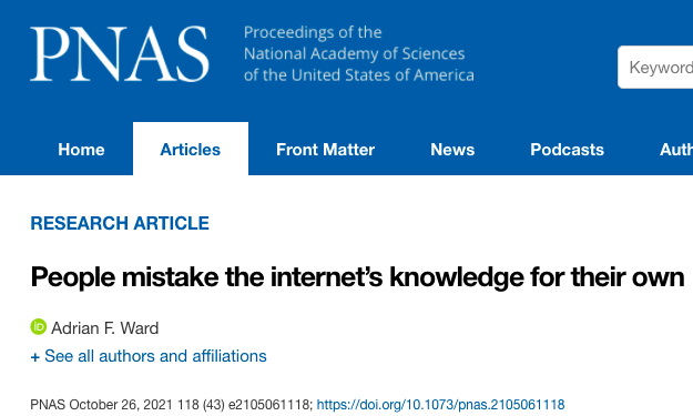 10月26日发表于PNAS的文章通过八项实验证明,当人们使用谷歌搜索在线信息时,他们无法准确区分自己记忆中存储的内部知识与外部设备存储的互联网知识,导致将互联网的知识误认为是他们自己的。与仅使用自己内部知识的人相比,使用谷歌回答常识问题的人不仅对自己获取外部信息的能力更有信心,而且对自己的思考和记忆能力也更有信心,并预测自己将来在没有互联网的帮助下也会知道得更多。