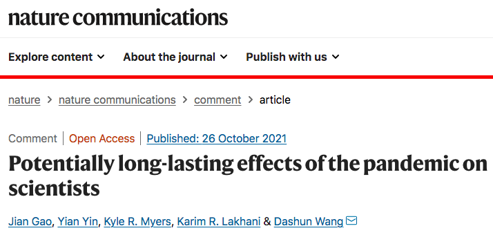 10月26日发表于 Nature Communications 的文章通过对2020年4月和2021年1月期间调查结果的分析,发现疫情对科学家研究时间的影响相对初期似乎有所缓解,但科学家启动新项目的速度却有所下降,由于新的研究想法和出版物需要很长时间才能成熟,故这一影响可能多年都不会显现。