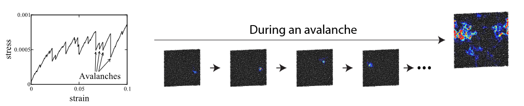 所有无序固体在低应变时弹性响应,但在应变足够高时产生塑性变形。当应变超过弹性范围时,无序固体通过间歇的局部重排而部分松弛,当应变量超过屈服应变时,固体开始形变。在屈服应变之外,许多系统表现出雪崩行为(avalanche behavior)。雪崩是由重新排列与弹性应力的相互作用产生的,当前采用弹塑性模型来描述这一过程:弹性应力的增加导致局部区域屈服和重新排列,而局部区域的重新排列又使某些区域应力增加。然而,该模型不足以完整描述雪崩行为的过程,因为具有相同微观相互作用的系统可以展现不同的行为,需要明确局部结构、重新排列及弹塑性的微观联系。