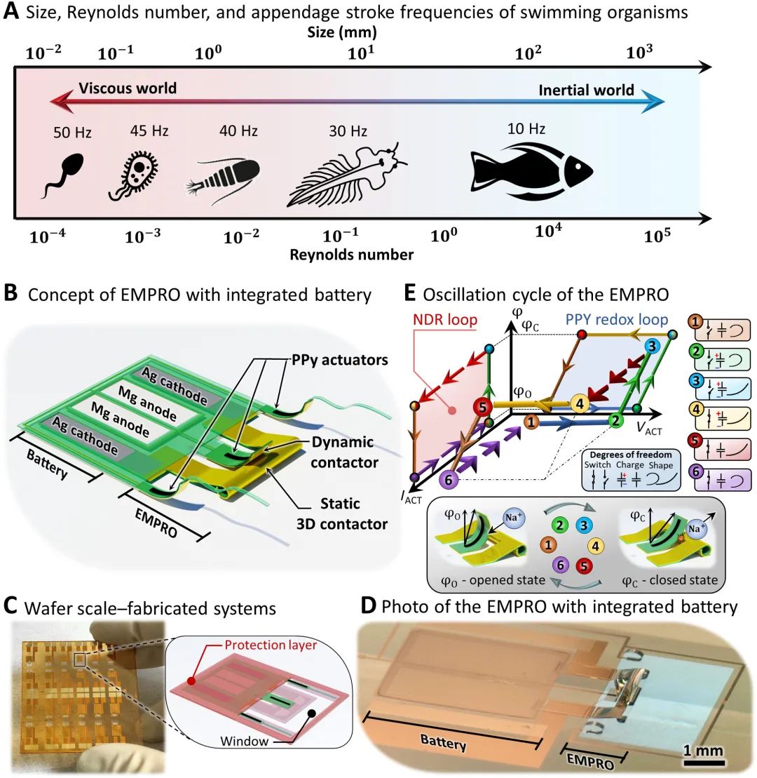 10月27日发表于Science Advances的文章受自然界基本自振荡的启发,使用电活性聚合物微驱动器和三维微开关创建了一种形状可变的低功率机电振荡器系统( electromechanical parametric relaxation oscillator,EMPRO),可以在高达95赫兹的生物相关冲击频率下进行机电振荡。该系统的低频振荡功耗约为10μw,相当于昆虫或浮游动物的功耗,其供能电池为一种由银和镁制成的具有生物相容性的电池。综合而言,该系统的柔软性、可塑性和生物相容性使其成为与软生物组织进行体内相互作用的理想材料,能够有力促进各种仿生微机器人的应用。