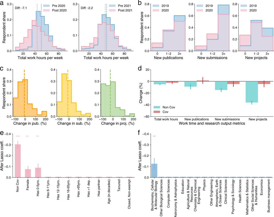 进一步研究显示,疫情对新项目启动速度的影响在女性科学家以及有幼年子女的研究人员身上更为明显,很可能进一步加剧了疫情对科学家影响不平等的程度,但该影响对各个领域比较均匀。该研究有助于科学资助者和机构领导人评估疫情对科学事业的长期影响,促进科学的恢复。
