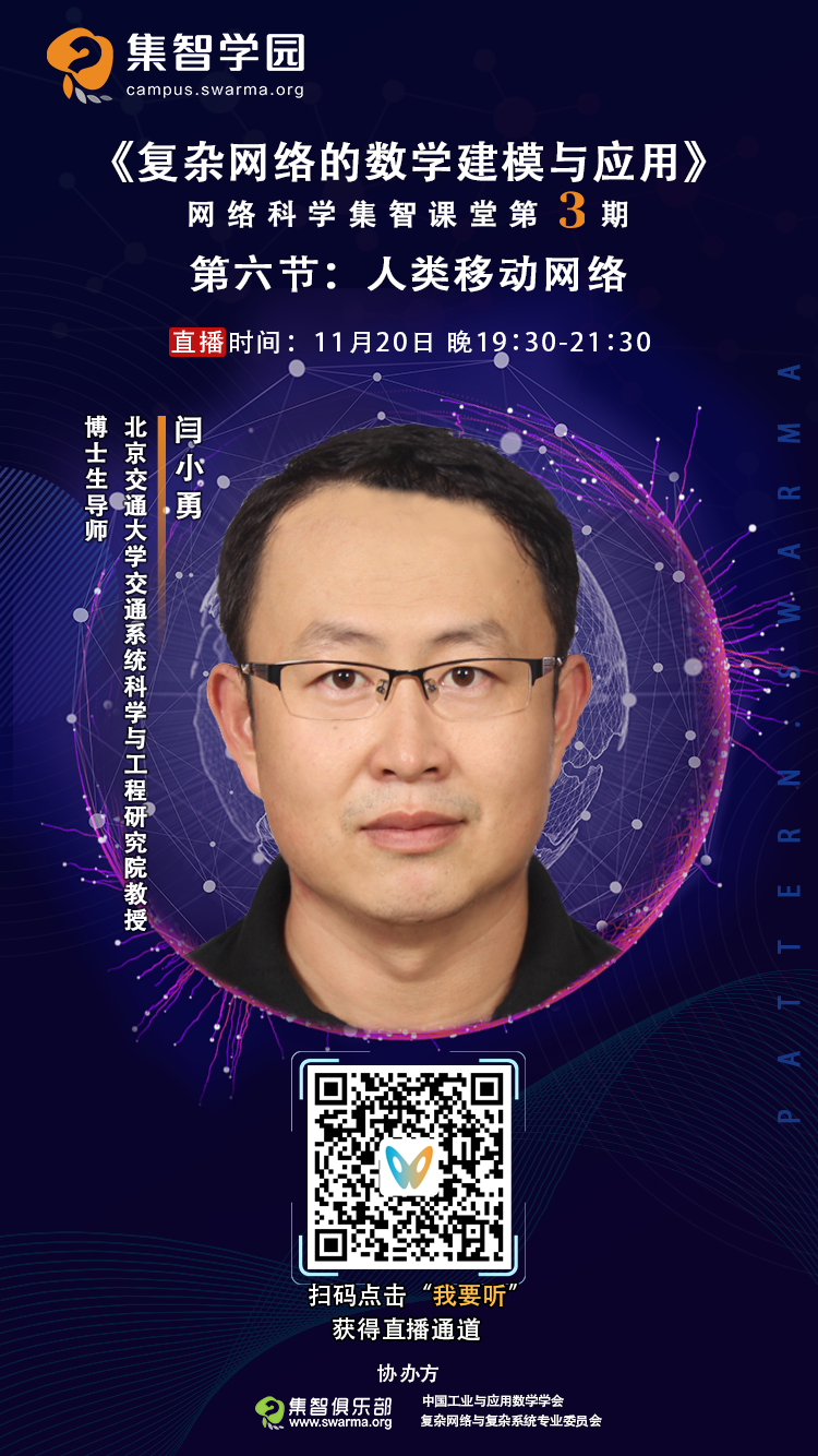 11月20日(周六)晚 7 点 30 分,北京交通大学闫小勇教授将为我们分享网络科学第三期第六课——人类移动网络。欢迎对这一主题感兴趣的朋友,扫码预约。