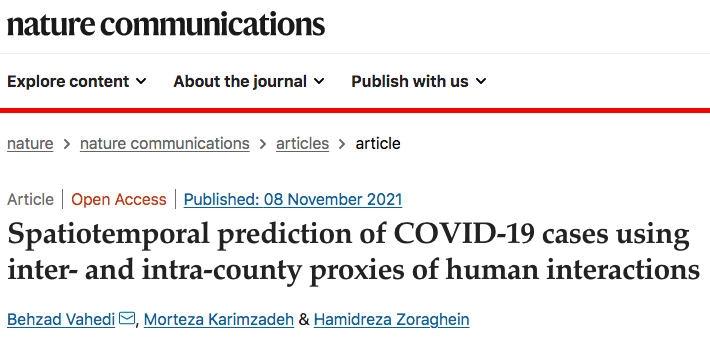 11月8日发表于Nature Communications的文章结合社交联系指数和人类流动性,开发了一个时空自回归(spatiotemporally autoregressive)机器学习模型来预测美国邻近地区县一级的新冠病毒疾病感染病例。将预测结果与美国新冠病毒疾病预测中心开发的基准模型对比,显示在两周的预测期内,该模型的预测平均误差降低了6.46% ,在四周的预测期内模型的预测平均误差降低了20.22%。