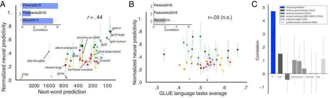 近年来,人工智能,尤其是人工神经网络(ANN),在目标检测和自然语言处理等任务上,都取得了令人瞩目的成功。以往的研究表明,一个深度卷积神经网络(DCNN)模型在目标检测领域表现越好,在预测大脑的下颞叶皮层的神经活动时就越准确,这表明了前者与后者在结构与功能上的相似性。同理,11月9号发表在PNAS杂志上的研究,对43个最新的语言处理模型进行了比较,试图找出它们在各种语言处理任务上的表现,和在预测大脑额颞叶的神经活动时的表现之间的关系。