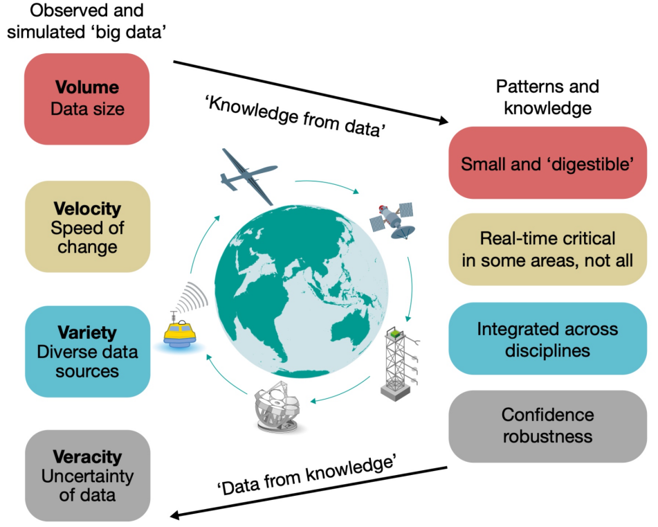 地球科学领域的数据在激增,以 CMIP5 气候模式为例,数据总量已达 3PB,而下一代的 CMIP6 更是达到了 30PB。地球科学的数据也具有大数据的 “4V” 特点:volume(数据体量大), velocity(更新速度快), variety(种类多样) and veracity(不确定性高)。地球科学的研究者需要面临以下两个问题:1. 如何从海量中提取有用信息;2. 在遵循物理规律的前提下,设计可以学到比传统数据同化方法更多信息的模型。