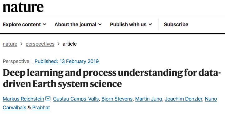 2019年,德国马克斯普朗克研究所、美国劳伦斯伯克利实验室等机构的研究者,合作发表于 Nature, 题为 Deep learning and process understanding for data-driven Earth system science 的综述文章(目前总引用已接近1000次)。系统阐述了大数据时代,地球系统科学所面临的挑战与机遇,深度学习方法在该领域的应用案例,存在的问题,以及未来的发展方向。