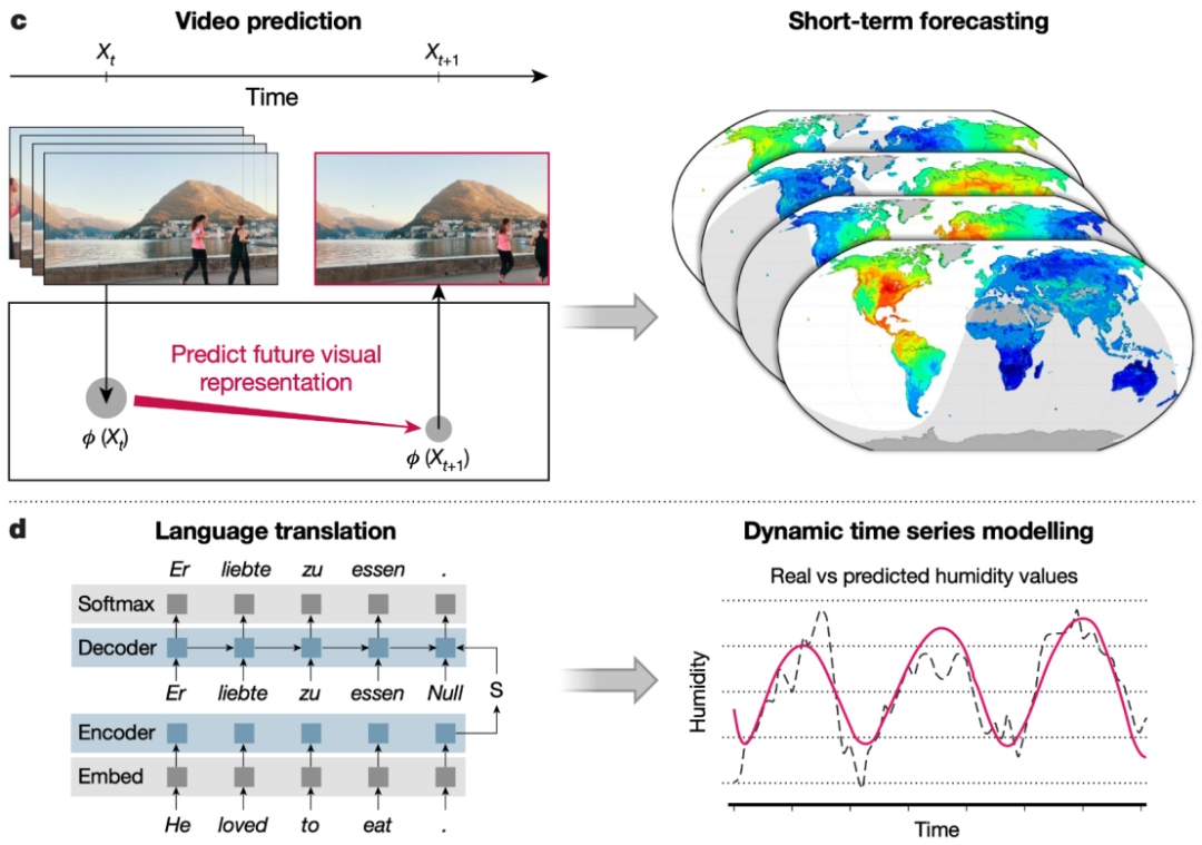 图2给出了典型的深度学习应用任务及其对应的地球科学问题。a. 图像分类与定位对应于极端天气的分类。b. 图像的超分辨可以应用于气候模式的统计降尺度。c. 视频预测类似于地球系统变量的短期预报。d. 语言翻译与动态时间序列的建模。