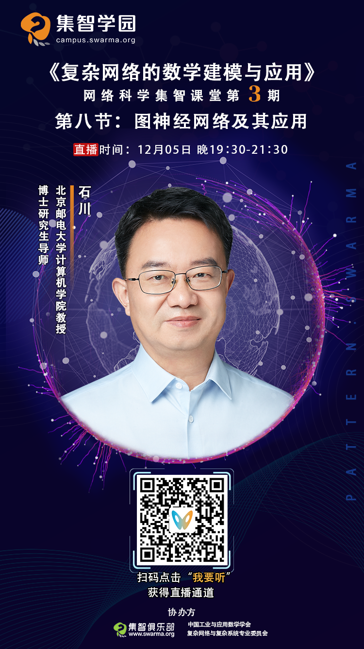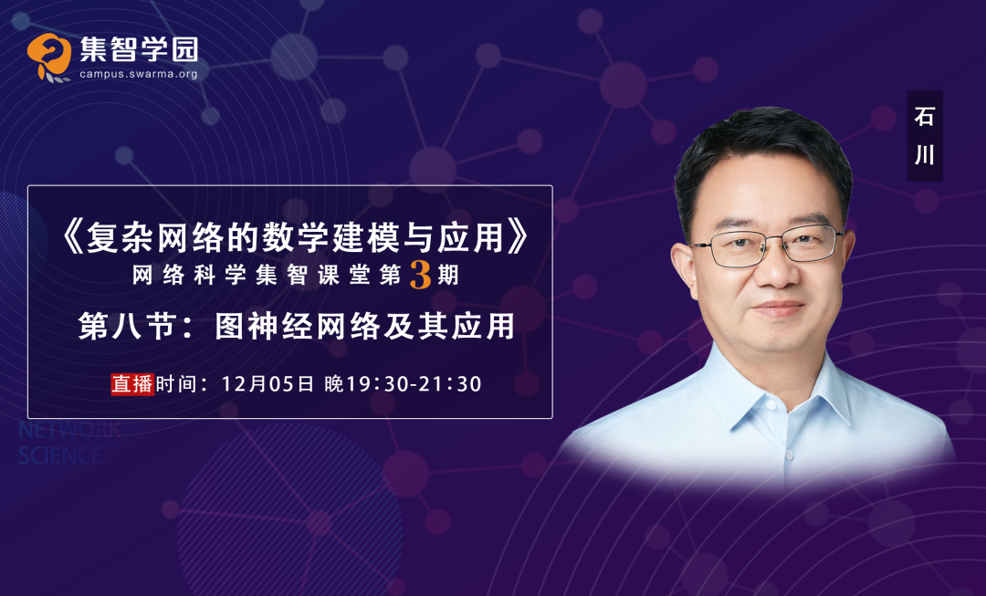 12月5日(周日)晚 19 点 30 分,北京邮电大学石川教授将为我们分享网络科学第三期第八课——图神经网络。欢迎对这一主题感兴趣的朋友,扫码预约。