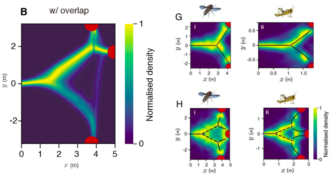 研究人员随后发现该算法具有极强的鲁棒性,于是猜想这种“分岔”过程很可能是“通用的”。通过叠加许多模拟动物的轨迹,确实发现了分岔结构普遍存在(见图2B)。进一步,研究人员通过实证研究检验计算模型的预测。为检验该模型跨物种的统一性,选择果蝇、蝗虫和斑马鱼分别作为飞行、陆生和水生动物的代表。为检验该模型跨环境的统一性,采用沉浸式虚拟现实技术,使得动物能够处于开放、真实的环境中,同时研究者能够精确测量动物在决策过程中的移动,结果显示所有物种都表现出与模型预测完全相同的分岔(见图2G、H)。