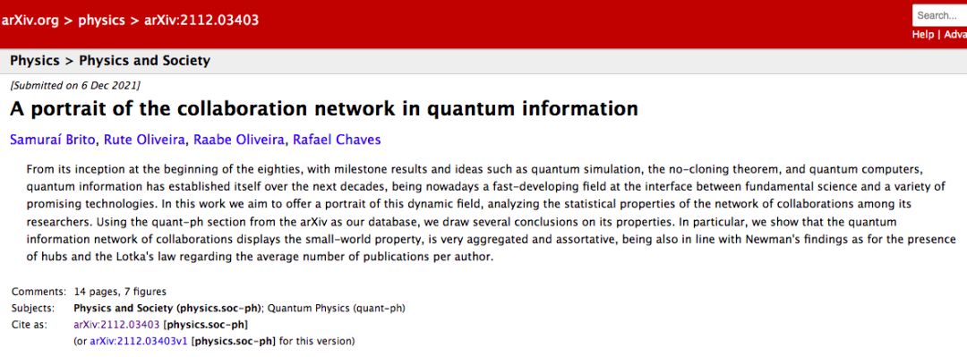 量子信息是位于物理学、计算机科学和信息论等学科交叉处的跨学科领域。自20世纪80年代以来,量子信息领域获得了长足的进步,量子模拟、量子计算、量子传感器、量子通信和密码学等一系列方向蓬勃发展。量子信息科学社区已有近三十年的历史,其中多数科学家自arXiv预印本网站成立以来就在此积极发布作品,这为网络科学提供了理想的研究案例。