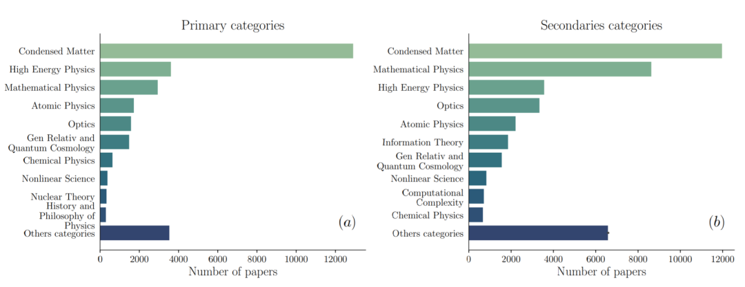 图1. arXiv数据中与量子领域交叉最多的10个领域。a中是以某个领域为主要类别,以量子领域为次要类别的论文。b中是以量子为主要类别且与其他领域交叉。