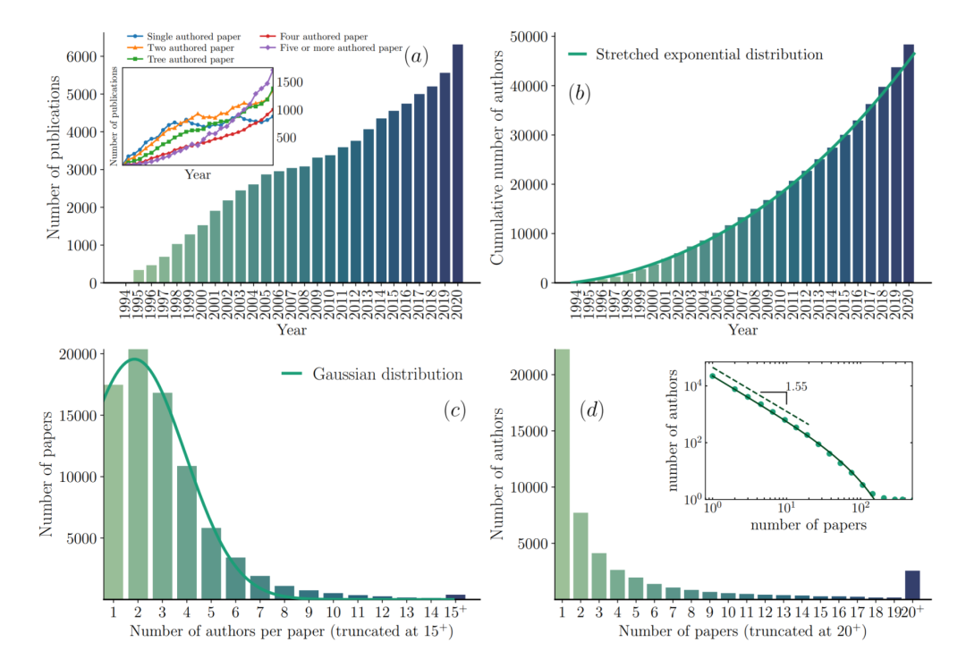 量化研究发现,量子信息在过去25年中吸引了越多越多研究者的兴趣,论文持续增多。1995年,Peter Shor 发表其里程碑著作的当年,量子信息领域还仅有300名作者,但到2020年底,该领域的研究人员已经超过48000人,这一过程可以用指数增长拟合。1994年论文仅有12篇,1995年就增长到335篇,到2020年该领域当年新论文发布数量达到了6309。从合作者数量来看,最开始大部分文章都还是单一作者,但多人合作的文章逐渐增加,尤其是5人及以上合作者的。
