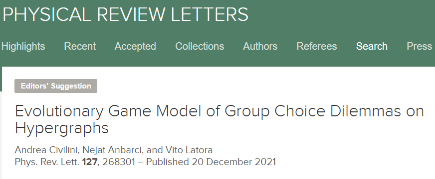 12月20日Physical Review Letters在线发表了一项新研究,研究者在超图上引入了演化博弈,模拟不同规模社会群体中进行冒进策略与保险策略之间的抉择。该模型自然地再现了经验观察到的决策的转变特点,即个人决策者的偏好与群体共识选择之间的差异。