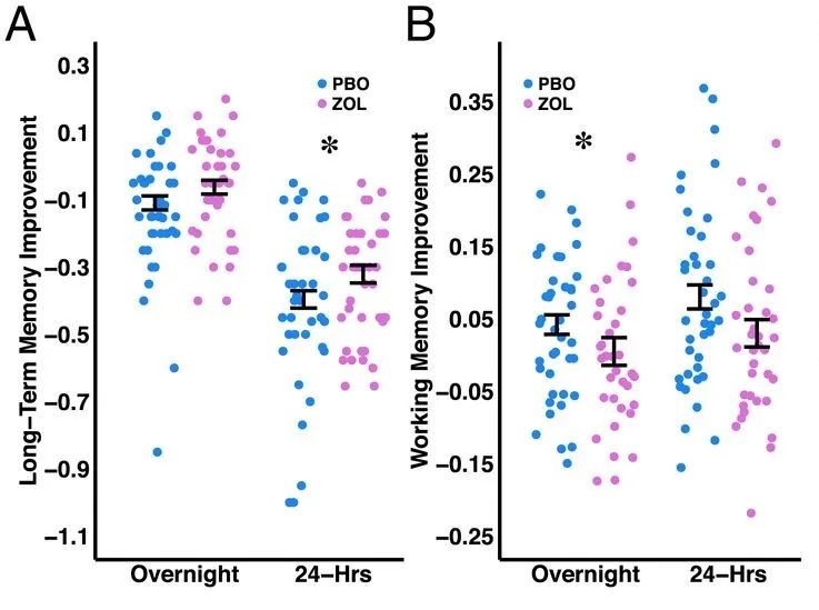 实验结果发现,与服用安慰剂的人相比,服用唑吡坦的人在长时记忆任务中表现更好,但在工作记忆任务中表现更差。脑电图和心电图的记录与实验结果一致,服用唑吡坦的受试者产生的纺锤波增加,心率变化减少,反之亦然。值得注意的是,大脑在长期记忆和工作记忆间的权衡能够预测被试醒后在两类任务中表现的差距,即更多的纺锤波/更少的心率变化预示更好的长期记忆/更差的工作记忆。