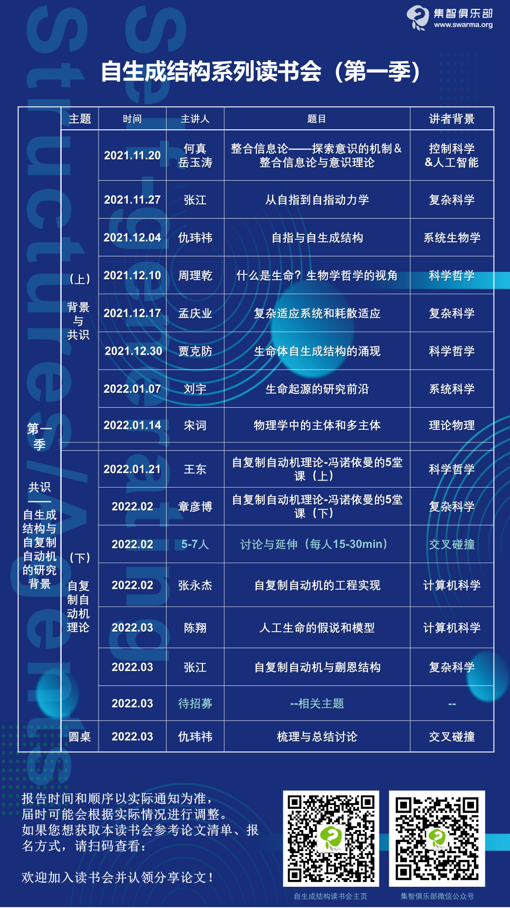自生成结构系列读书会第一季《共识——自生成结构与自复制自动机的研究背景》的下半场,将以自复制自动机理论为核心进行讨论及分享。其中本期报告为第九期,主题为“自复制自动机理论-冯诺依曼的5堂课(上)”。本系列读书会希望通过交流与共同学习,追寻不同学科中相关的理论前沿,以“自生成结构”为核心建立跨学科共识,通过辨析主体涌现与分布式涌现在复杂活系统形成中的角色,探索对自指与自生成结构的定性认识和定量刻画方法,探索对生命及类生命的活系统复杂性的全新认识。欢迎对本话题感兴趣的朋友报名参加!
