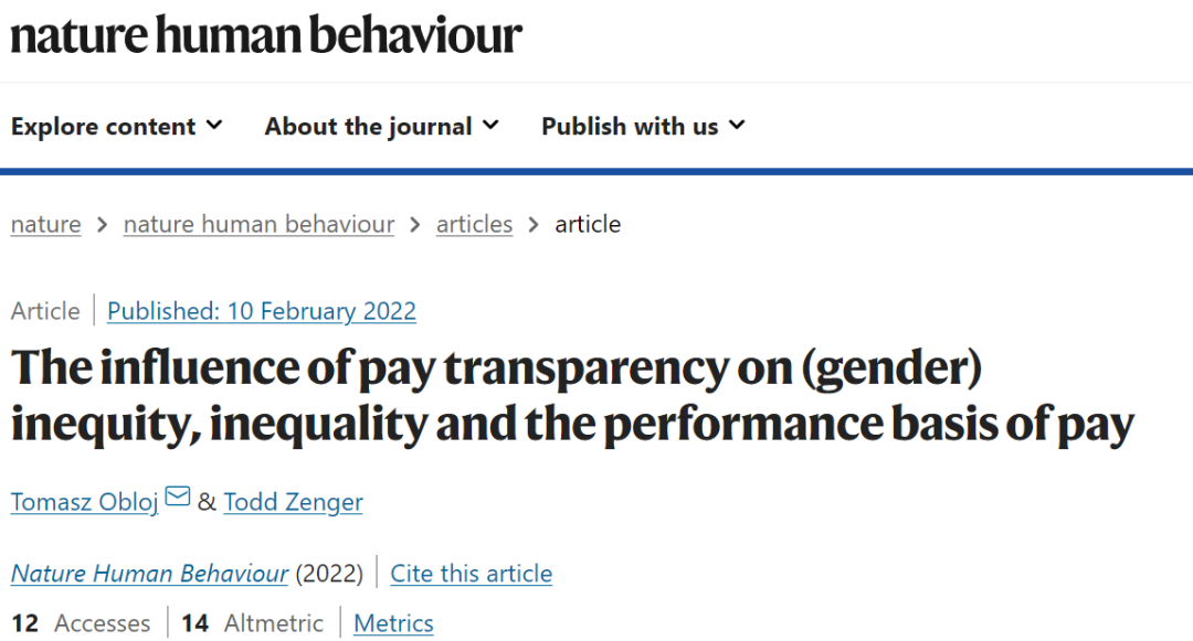 论文标题:The influence of pay transparency on (gender) inequity, inequality and the performance basis of pay 期刊来源:Nature Human Behaviour 论文地址:https://www.nature.com/articles/s41562-022-01288-9