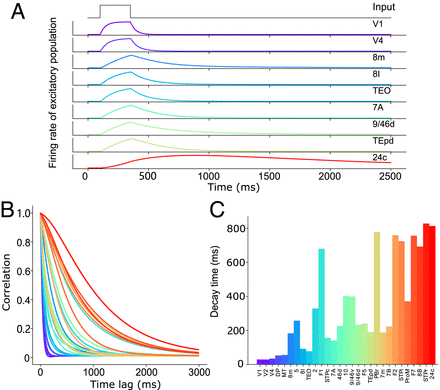 图:猕猴多区域模型模拟的分层时间尺度现象。(A)输入到V1区的脉冲沿着层级传播,随着它的传播,显示出逐渐增加的衰减时间。(B)区域活动响应白噪声输入到V1的自相关。(C)所有区域的主要时间常数,通过将单指数或双指数拟合到自相关曲线来提取。在A-C中,区域按照解剖层次结构中的位置进行排列和着色。