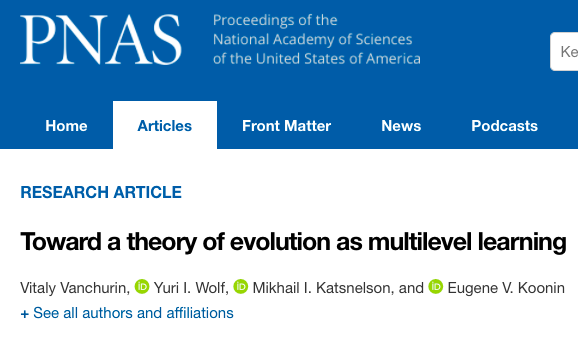 论文题目:Toward a theory of evolution as multilevel learning 期刊来源:PNAS 论文地址:https://www.pnas.org/content/119/6/e2120037119