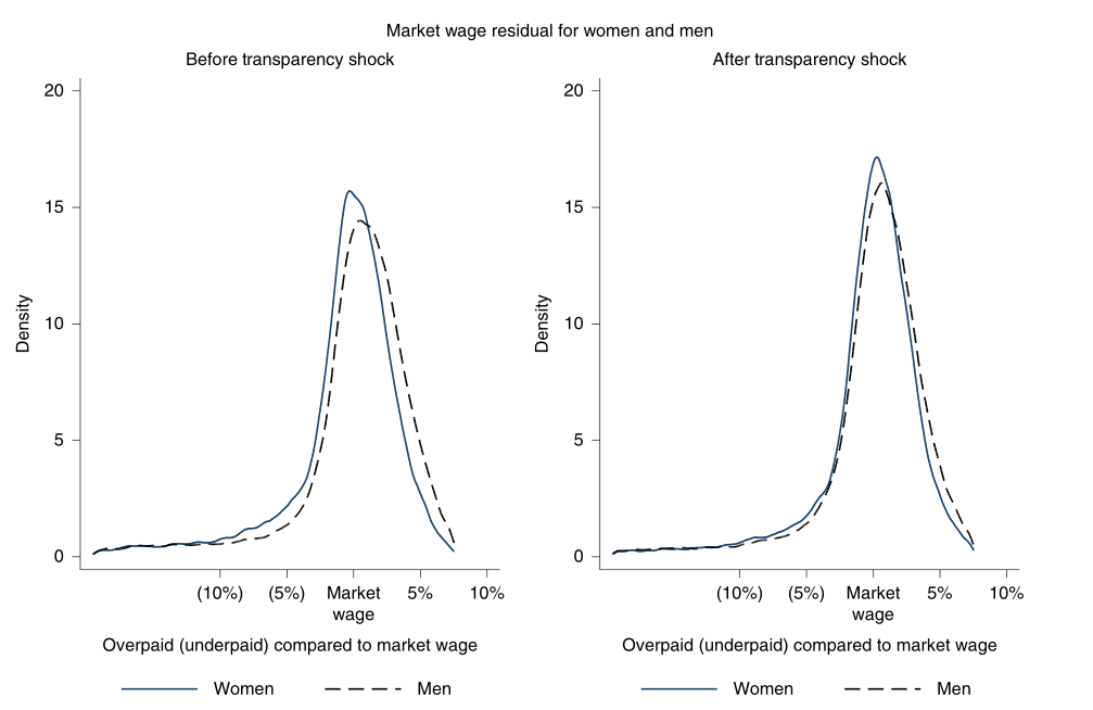图:组织中的公平:按性别和透明度冲击分配市场工资剩余情况。