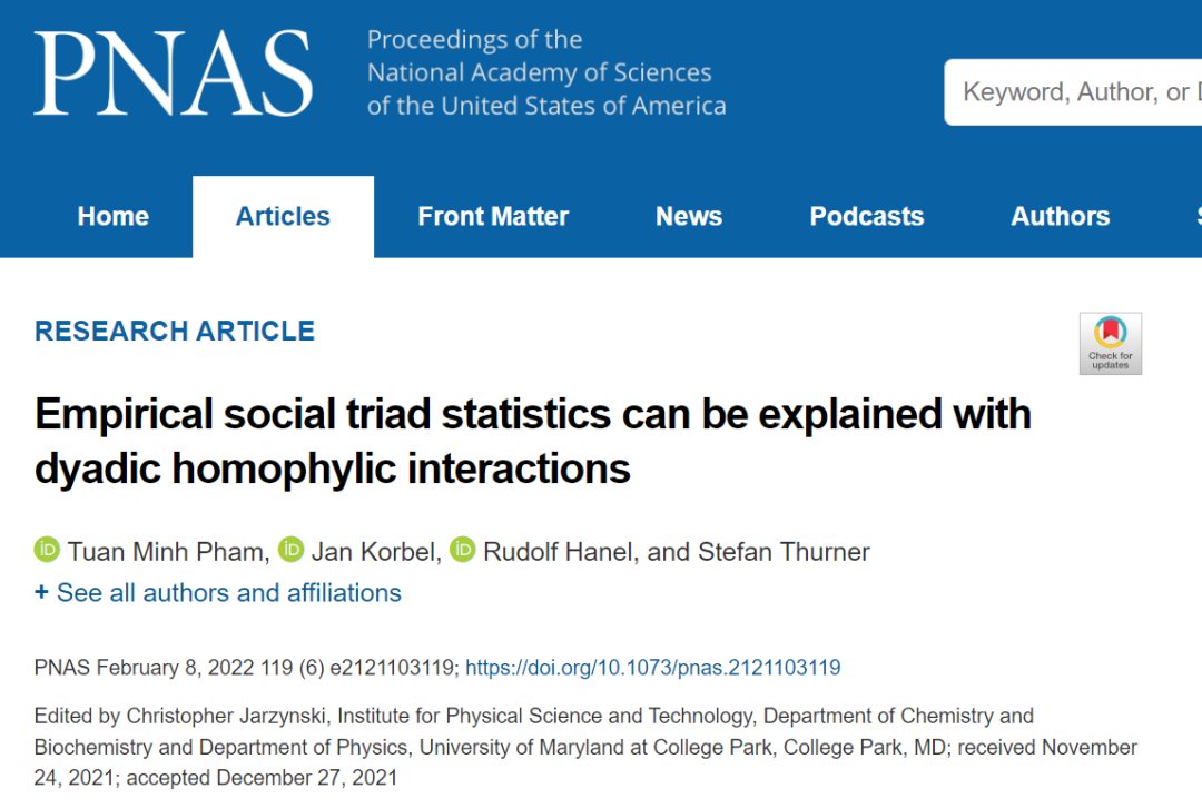 论文标题:Empirical social triad statistics can be explained with dyadic homophylic interactions 期刊来源:PNAS 论文地址:https://www.pnas.org/content/119/6/e2121103119