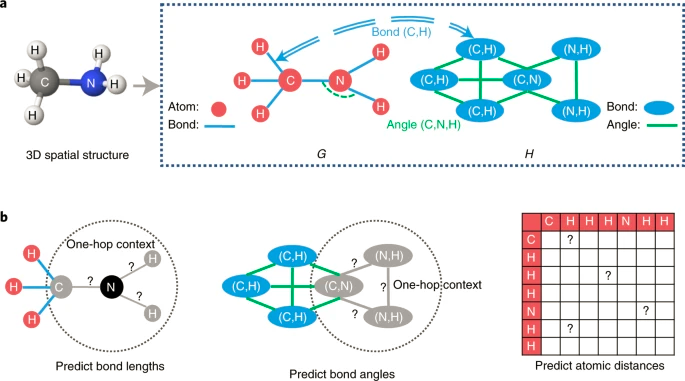 图:GEM模型架构。(a)原子键图G中,连接原子的化学键为边。在键角图H中,连接两化学键及三个原子的键角为边。虚线箭头指出了两图间元素的关联。(b)几何级自监督学习任务的演示。黑色圆圈代表所选原子,G图中的灰色圆圈代表相邻的原子,G图中的灰线及H图中的灰色椭圆代表相邻的未知化学键,H图中的灰线代表相邻的未知键角。