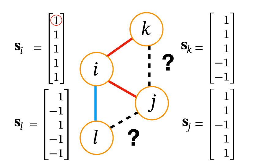 图:一个社会中状态和边更新的示意图。每个个体都有一个状态向量,其分量表示(二进制)对G = 5个不同关系的状态。红色和蓝色边分别表示积极和消极关系。问号表示i的邻居之间的未知关系。