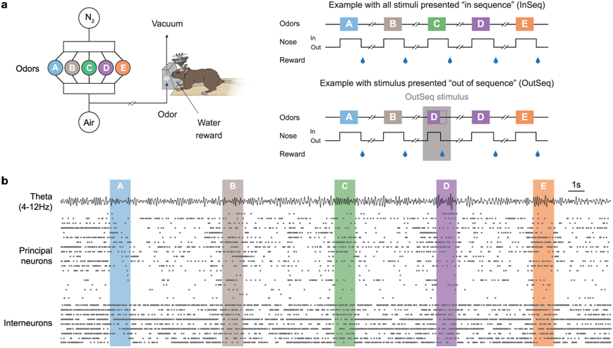 图:动物执行复杂的非空间序列记忆任务时海马区 CA1 的神经活动示意图。(a)展示了实验过程,用小鼠作为实验对象,气味刺激代表非空间事件。使用气味自动传递系统(左图),按照气味A-B-C-D-E的顺序,以五秒为时间间隔,重复对小鼠进行刺激,要求小鼠判断气味刺激是顺序(InSeq,例如A,B,C)还是无序(例如InSeq,A,B,D)进行的。如图右所示,在一个实验周期中,一半时间有序气味序列,一半时间使用无序气味序列,分别重复刺激小鼠。具体地,使用携带气味的鼻戳刺激小鼠的鼻子,在1.2s的时候会发出气味刺激结束的音调,若小鼠在此时间内保持鼻尖不动,表示识别出了InSeq,若收回鼻子,表示识别出了OutSeq。如果识别正确,小鼠可以喝到水,否则程序终止。(b)示例了一个气味刺激序列期间,假定的主要神经元和中间神经元的神经组织活动和 theta 震荡(带宽4-12Hz)。根据触发气味A的传递端口的峰值发射时间,可以区分出假定的主要神经元与中间神经元。