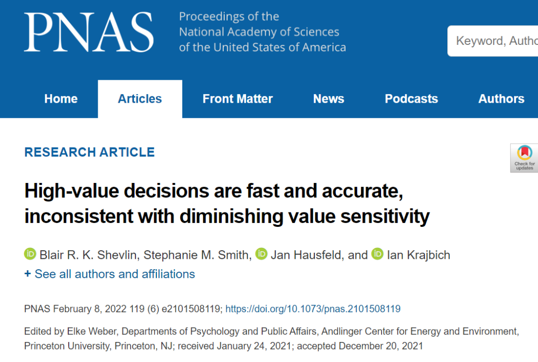 论文标题:High-value decisions are fast and accurate, inconsistent with diminishing value sensitivity 期刊来源:PNAS 论文地址:https://www.pnas.org/content/119/6/e2101508119