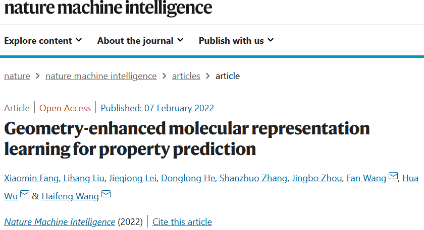 论文题目:Geometry-enhanced molecular representation learning for property prediction 期刊来源:Nature Machine Intelligence 论文地址:https://www.nature.com/articles/s42256-021-00438-4