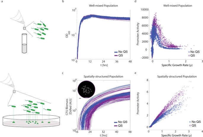 图:(a) 本研究中使用的液体和空间结构环境的示意图。(b) 液体培养中铜绿假单胞菌生长的光密度时间序列。[蓝色]没有外源群体信号的生物量增长。[紫色]生物量增长与外源quorum信号。(c) 由成像仪和定制软件生成的DsRed荧光时间序列描述P. aeruginosa在菌落形成单位(CFU)中的生长。[蓝色]没有外源quorum信号的生物量增长[紫色]添加外源quorum信号到平板培养基的生物量增长。[插图]显示48h菌落的样板。比例尺1厘米。(d) PrhlAB启动子活性与培养速率的关系。[蓝色]没有外源性仲裁信号[紫色]有外源性仲裁信号。(e) PrhlAB启动子活性与CFU生长速率的关系。[蓝色]没有外源性仲裁信号[紫色]有外源性仲裁信号提供在板介质。