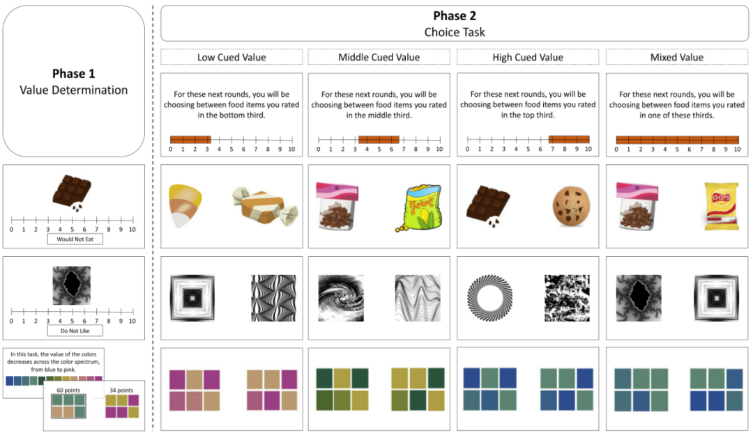 图:每项研究的时间表。每个实验包括两个阶段,第一阶段包含李克特量表(研究1和2)或将颜色映射到程度值(研究3)。第二阶段包括每个版块开始时的提示,然后是一系列使用相同价值类别的物品进行的15个选择试验。