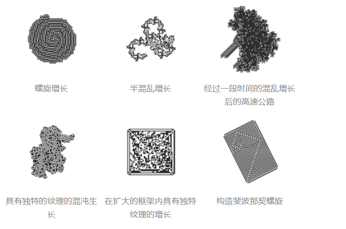 混乱 Chaos。经过几百次移动,一个大的、不规则的黑白格子出现了。直到大约10,000步后,蚂蚁沿着一条伪随机路径直线行进。
