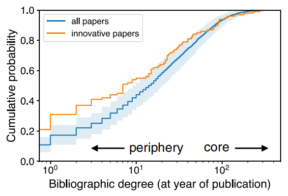 该研究最关键的发现,如下图所示,对比创新性论文和所有论文在共引网络中的累积度分布,可以发现创新性论文更多位于共引网络的边缘位置。