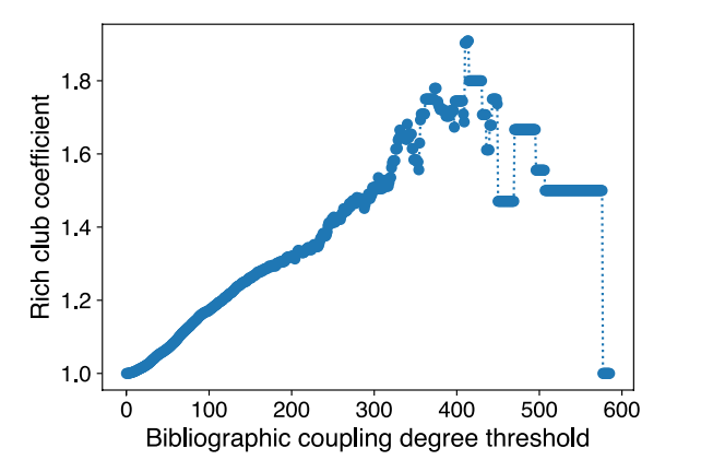 在网络科学中,富人俱乐部(rich club )指的是网络中的节点,其连边数比预期得更多。在共引文网络中,在一定的连边度范围内,呈现出度数越高,富人俱乐部效应越严重的现象。这说在引文网络的越是中心节点,越是该学科的核心概念,越是研究者们无法绕开的基础。
