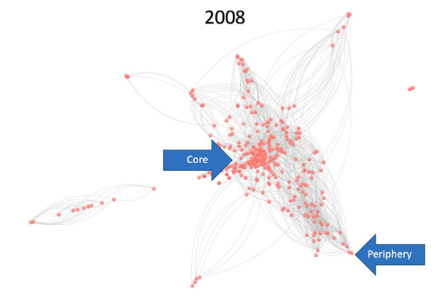 总结来看,该研究的贡献首先是提出了一个新颖的、基于文本词频的论文创新性评价指标。其次是在构建的共引网络中,发现了预期的“富人俱乐部”现象,并说明创新性的论文有更大比例分散在共引网络的边缘。对这一现象的解释是,位于共引网络核心的论文,表现出较高的与其他论文的相似性。而位于边缘的论文,有更大的灵活性,更有可能产生创新。