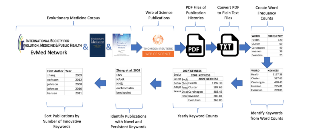 研究者通过将论文转移为文本,并按年份进行词频分析,得出按年度的高频关键词。据此可以找到那些前瞻的“创新性”论文——其关键词在当年的热点词汇中没有出现,却出现在下一年。