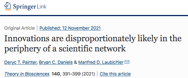 创新即可以看成通过集体运算解决一个问题,但对创新的关注点,往往聚焦于少数做出了有影响力贡献的个体。来自圣塔菲的研究者,在Theory in Biosciences的集体行为特刊中的论文,通过对2018年以前进化医学领域发表的6000多份论文引用网络以及论文文本的分析,发现大多数创新都发生在科研网络对的边缘地带ーー这表明,避开当前的研究范例,可能有利于创造新颖而持久的变化。