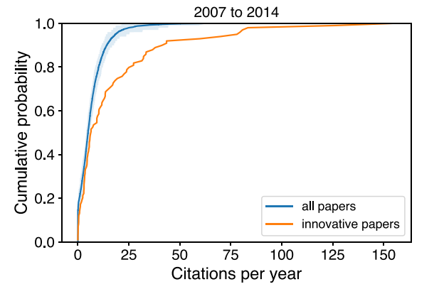 图6. 创新性论文和所有论文的引用累积概率密度的对比