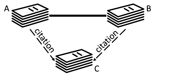 该研究的基础,在于“共引连边”的概念。如下图所示,论文A和B都引用了论文C,这意味着两篇论文之间存在着共同的研究基础。由此在共引网络中,在论文A和B之间(两篇论文至少有一篇共同引用的论文)建立一条共引连边,这样就可构建一个共引网络。所构建出的共引网络,会包含一小部分核心节点,代表某一学科内的核心概念,而周围节点则代表外围概念。